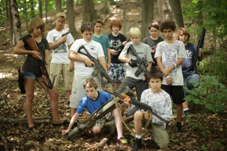 “I Declare War,” co-directed by Jason Lapeyre and Robert Wilson, is an allegory about kids’ playing war that works better as entertainment than as allegory. The toy guns that this group of Canadian boys (and one girl) make out of sticks, cans, what have you, transform into real weapons blazing away with live rounds in the action sequences of this elaborate kids’ game run amok. And when they do, combat movie cliches fall one after the other as the kids cross the line from fun-and-games to psychosis and torture.