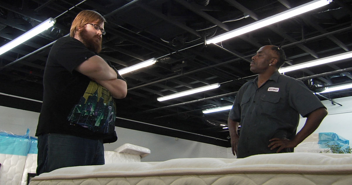 Their argument and break-up is just the first serving of f-bombs of Rob’s effed-up day. Selling mattresses for Preston (Kenneth McGregor) is no walk in the park. No customers, endless smoke-and-gab breaks with his pal Manny (Coolie, in his weirdest hairdo ever), it’s a wonder either of them draws a salary.