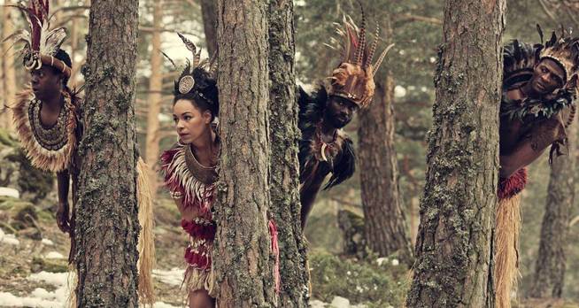 But there are no tourists. And then, these four Africans in pre-colonization tribal wear show up. They’re on the run, dangerously under-dressed for the snowy weather. The Civil Guard is after “four colored individuals.”