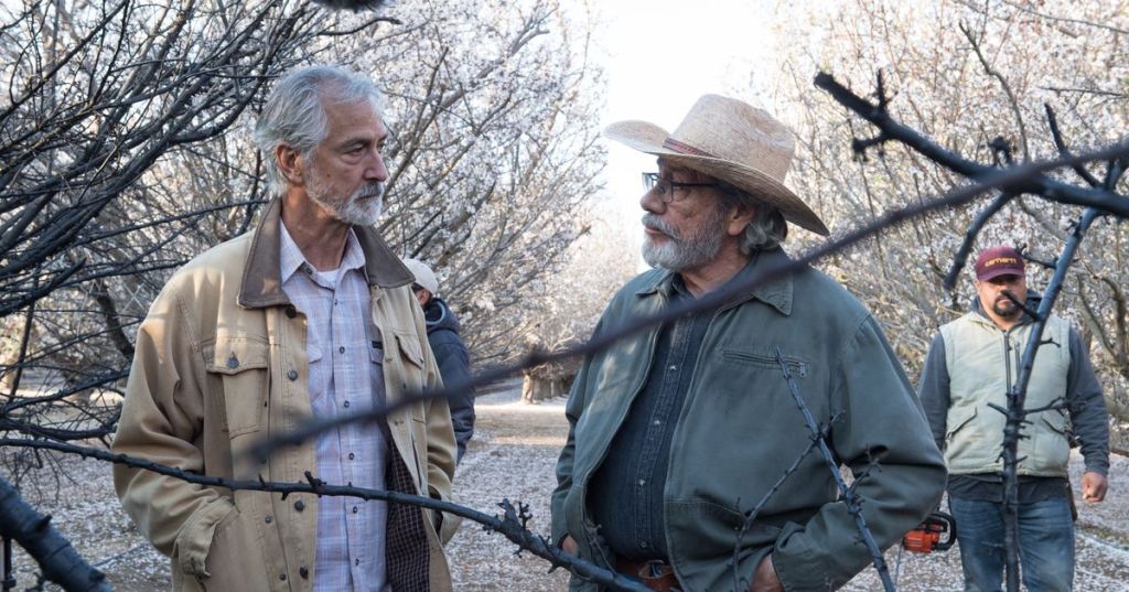 “Inspired by a true story,” it’s as much a cause as a movie, which drew Edward James Olmos to it. He directs and co-stars in this story of a Bakersfield area almond grower at war with the Big Oil company that poisoned his groves and his life.