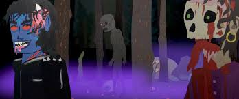 They’re each off on their own when a demon takes to the main music stage, kills and creates recruits (like zombies) and takes over the town. There’s nothing for it but to flee to the mountain, and the old haunted mine, fighting/ducking demons every step of the way.