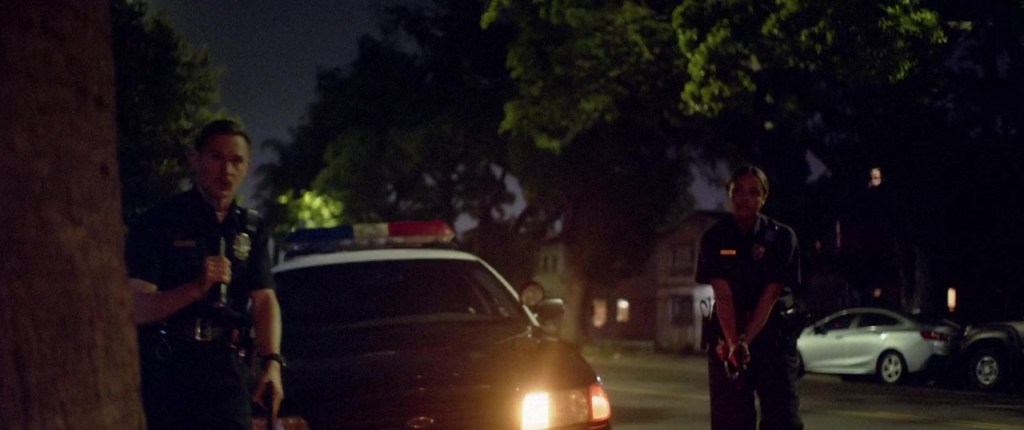 The victim (Chiké Okonkwo), whose story is barely glimpsed here, is not just a big 30something Black man with tattoos and a pullover hoodie. He’s a high school football coach, watching a ball game with his little girl. The call, a “hostage situation” with a distraught suspect threatening his family, was a case of “swatting,” a prank that informed the police of a non existent “crime” created an incorrect set of expectations.