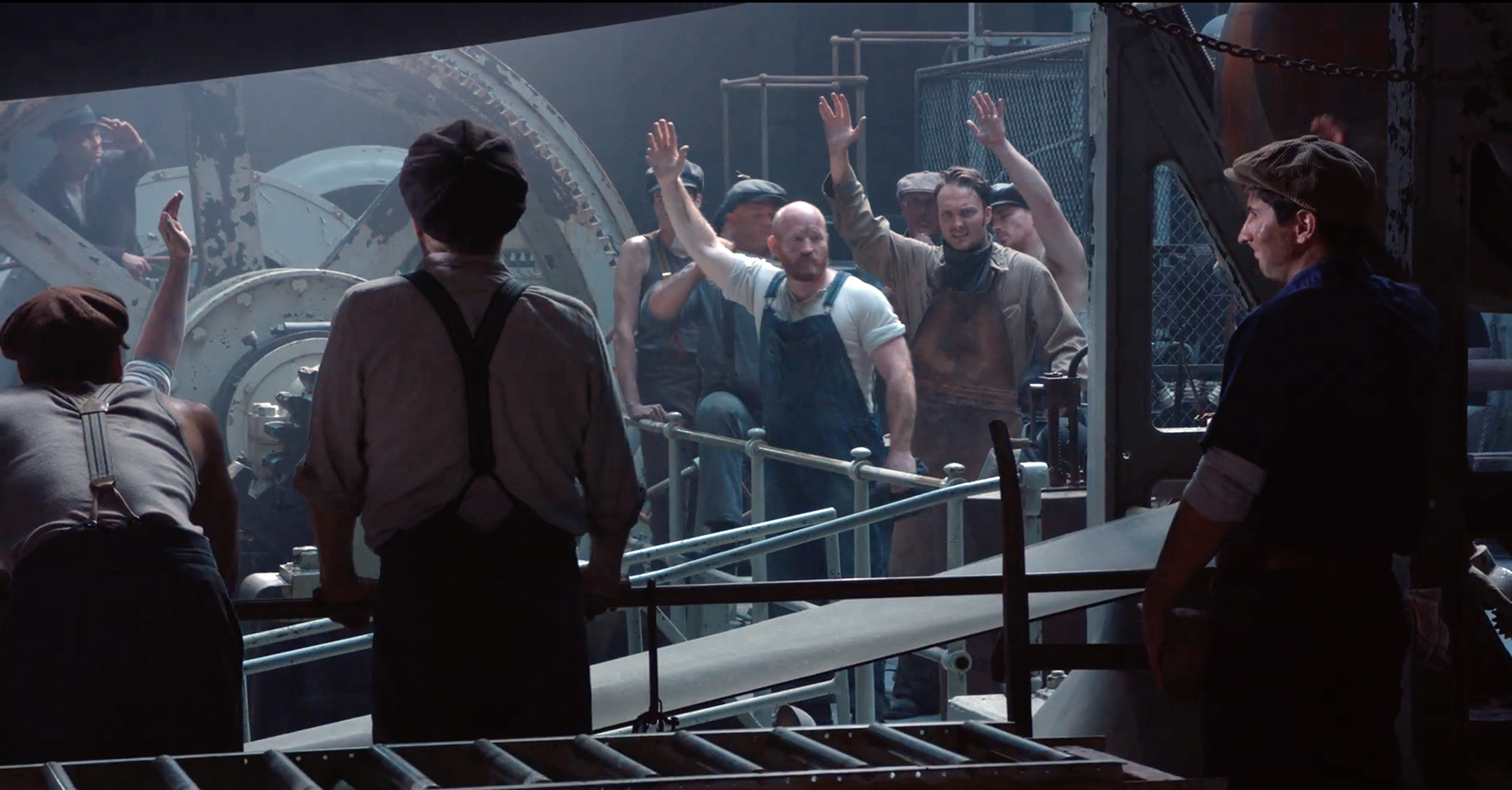 Troops deployed or deploying themselves to intimidate workers, goons hired, cops whose loyalties shift back and forth, a government pushed to change laws overnight to make protesting and striking illegal, racism and anti-Semitism dividing the strikers — that’s a lot to cover in a film. And every so often, a song comes up.