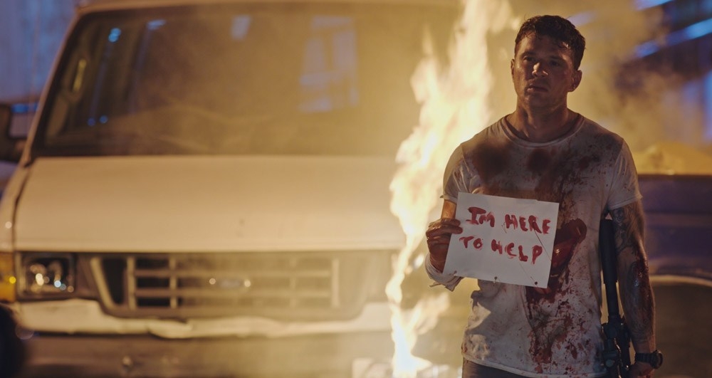 Battered and bloodied, and armed with an assault rifle, he’s in need of a ride. So he’s written a sign in his own blood to indicate his intentions to anybody who might drive by.