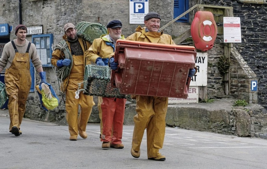 Danny is pranked by his douche of a boss (Noel Clarke) on a group bachelor party/scouting trip to Port Isaac on the Cornwall coast, left behind by that boss to “sign,” “do what you do” with these ten local fishermen who sing “Nelson’s Blood,” “Blow the Man Down” and “What d’ye Do With a Drunken Sailor” on the docks every weekend they aren’t at sea.