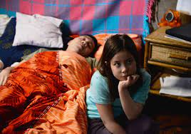 And that’s the very time that Maja’s acting-out goes public. She’s convinced that Dad is “forgetting Mom,” and making time with the pretty blonde (Aleksandra Domanska) in the building across the way. So she breaks out the binoculars and starts spying on them.