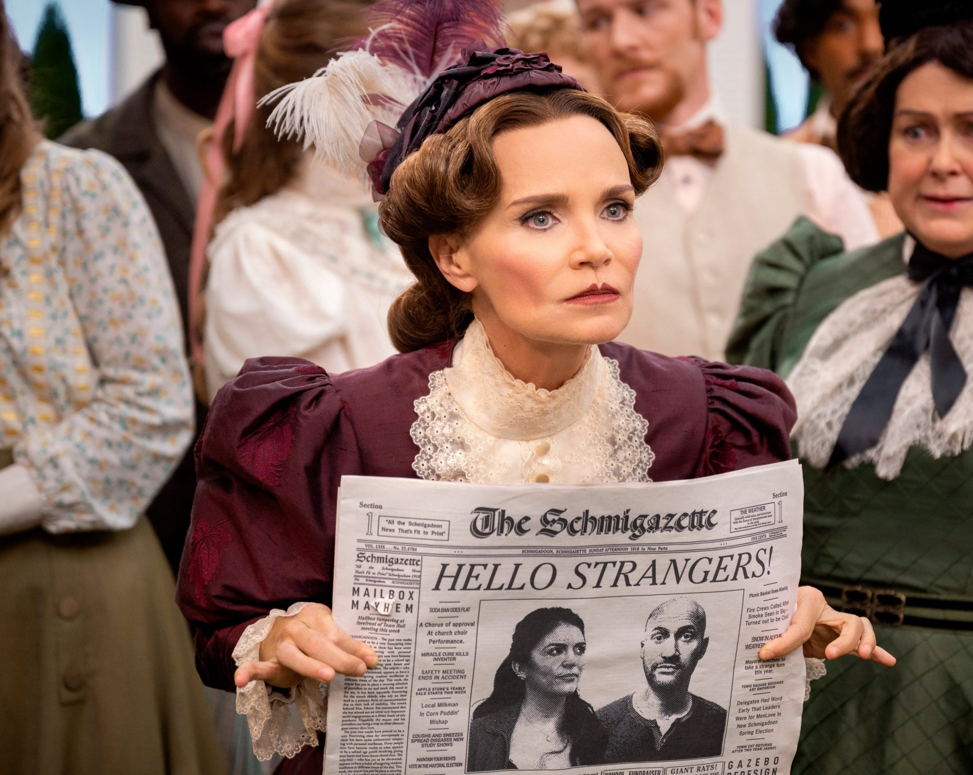 Musical theater royalty Kristin Chenoweth plays the town’s puritanical head of Mothers Against the Future and preacher’s (Fred Armisen) wife, and equally royal Alan Cumming is the confused, Mayor Aloyius Menlove. He gets a number or three, and Ann Harada playing his wife lilts through an “oh, honey” number, as the last to get a clue.