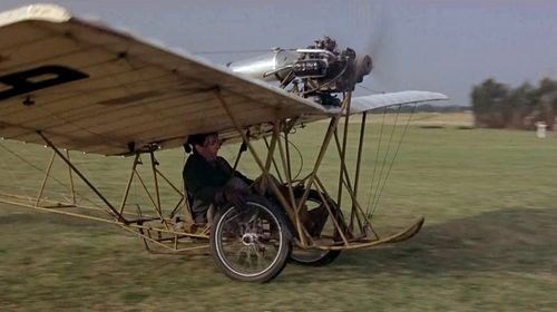Here is a version (top left) of the Alberto Santos Dumont “Demoiselle,” the most famous monoplane of the era, here flown by the French entrant (Jean-Pierre Cassel) in the movie’s London to Paris air race.