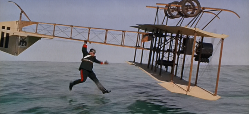 There is the Roe IV British triplane, the vehicle the villain (Terry-Thomas, blast him, lower left) flies. There’s a Wright Flyer (Stuart Whitman‘s Arizona barn-stormer flies this) and a Bristol Boxkite and Blackburn “Type D” (Gordon Jackson‘s Scots pilot’s “kite”), and a Philips Multiplane, Passat Ornithopter, Lee-Richards Annular Biplane, Vickers 22 Monoplane, an Avro, a Dixon Nipper, and an Eardley Billing Tractor biplane (upside down with the Very German Gert Fröbe (his stunt double) dangling from it.