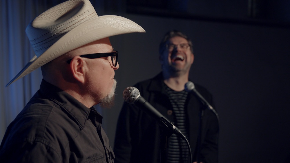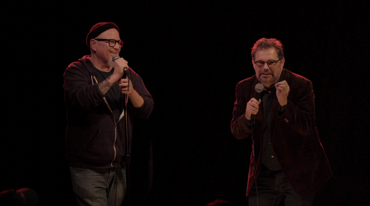 On stage, Goldthwait pokes the bear again, bragging about going on the write and direct movies while “Jerry makes videos in old cars with a GoPro,” while Goldthwait-the-filmmaker cuts to shots of him and Gould riffing in a rental car in between venues, filmed by a…GoPro?