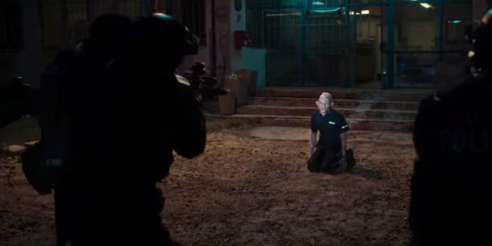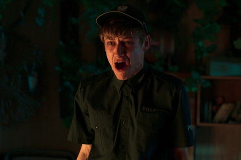 “Nobody Sleeps in the Woods Tonight 2” picks up the story the day after the night of the “cabin in the woods” slaughter of the innocents. Incel cop Adam (Mateusz Wieclawek) shows up at his dilapidated rural station where two carbuncled-monsters, creatures created by an oozing meteorite the night before, are locked up.