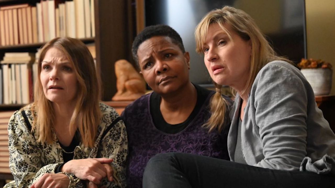It’s Halloween, just before the election, and Cass (Pinkins), Anglo-African husband Bobby (Adesola A. Osakalumi), Lily (Kathryn Erbe) and Jewish joker Nick (Jake O’Flaherty) Latin immigrant Rocky (Rubén Blades) and Croatian Serb Emelia (Luba Mason) sing the old Gospel protest song, “Marching Up to Freedom Land,” mutter about the “white supremacy” that the past four years has brought out from under a rock and even stop to pull down a one of those racist road signs yokels have been putting up all over the rural South since Trump gave them permission.