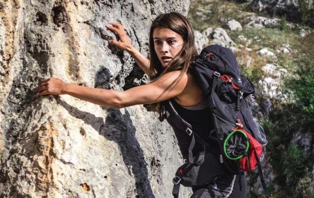 Brittany Ashworth plays Kelly, mourning her late fiance and climbing mentor who died making this climb, witness to the murder of her climbing partner (Anaïs Parello), hounded up the rock face by homophobic, sociopathic and murderous Josh (Ben Lamb) and his reluctant accomplices.
