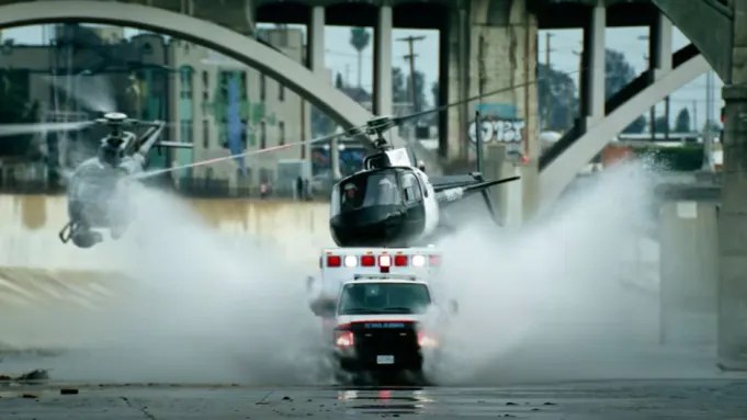 The jaw-dropping moments come early — Cam’s first paramedic call of the day involves a child impaled in a car crash — and almost often enough to keep us invested. There’s a hilarious cell phone/Facetime “consultation” on a grisly bit of mid-chase back-of-ambulance surgery and the choppers swoop in so low they almost sandblast the paint right off the ambulance.