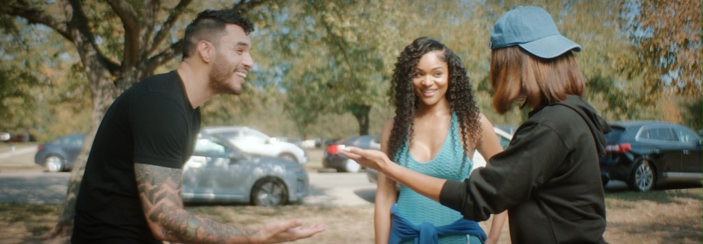 Eric and Tyler (Xavier McKnight and Vonzell Scott) step out of a revival house cinema and into an Uber, which is Eric’s undoing. The traditionally-clothed/close-minded African driver gets his nose bent out of joint by having two two guys almost kiss in his backseat. He comes at them with a baseball bat, and Eric shoots him.