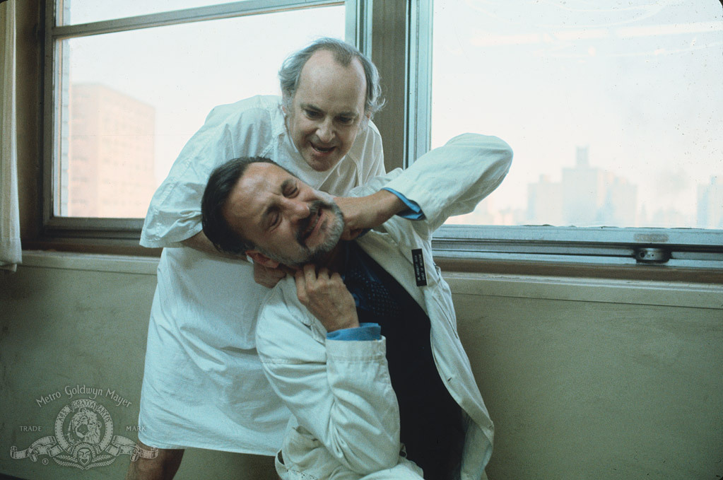 Over the course of the next day and a night, others will die, some will be clubbed by an unseen assailant, the hospital will come under siege for its efforts to demolish a neighboring tenement for expansion, the harried chief administrator (Stephen Elliott) will try to juggle all this, Dr. Bock will drink Smirnoff’s and try to pretend that he’s struggling to remember the names of the sea of white (mostly) male residents he leads on rounds and the frazzled billing officer (Frances Sternhagen, funny) will try to get the “Blue Cross? Blue Shield?” particulars from patients because the arrogant medicos — doctors and nurses — can’t be bothered.