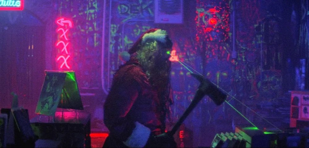 The satanic laser-eyed Santa is created with a couple of lights, a dude in a suit and a metallic gears and servos whirring sound effects. We see many of “his” attacks through those piercing green luminescent eyes, a killer-cam eye view.