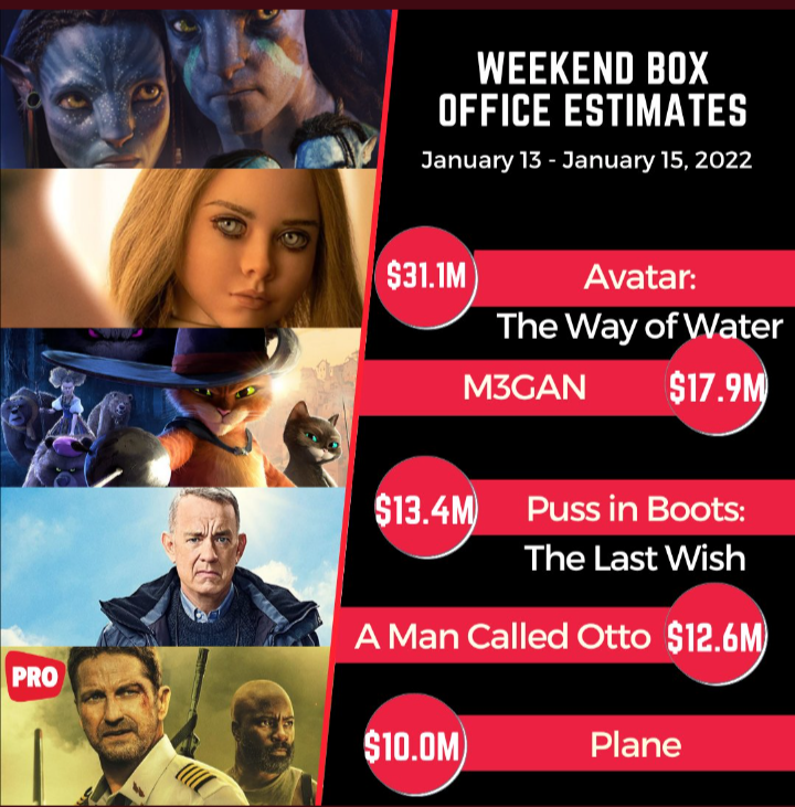 The reason? “Avatar: The Way of Water” ($35 million over four days), “M3GAN” in the $20-22 range over those same four days, “Puss in Boots: The Last Wish” bringing in $16 million from families and “A Man Called Otto” reaching mid-America as it opens on thousands more screens and earns $14 million for its trouble.