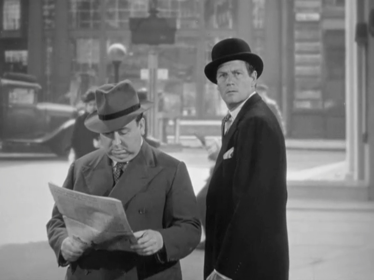 Laraine Day, most famous for this film but who worked into the “Murder, She Wrote” era, plays Carol, the daughter of the head of the Universal Peace Party. She is with our correspondent, who figures he needs a bowler hat and high-class moniker — “Huntley Haverstock” — for this new assignment, and a British reporter friend she knows when that pivotal assassination happens and the murderously merry chase begins.