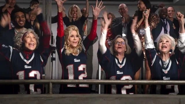 Widowed Maura (Moreno), retired college professor Betty (Field) and onetime TV-model turned “erotic fan fiction” novelist Trish (Fonda) gather, gab, don jersey and repeat their rituals (knocking over the chips) to “help” their team and their Tom win, week after week.