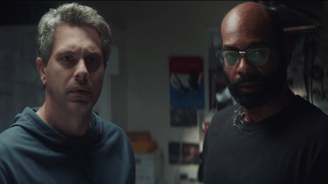 Our writer-director lets us know how to write “names” into your low-budget film’s cast, by putting the movie’s two most famous actors onto basically a single TV interview set (no background, just darkness behind them) for a series of scenes intercut into the action, scenes that might have taken just a couple of days to shoot.