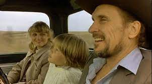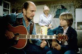 He plays Mac Sledge, a country music has-been, a Willie Nelson singer/songwriter type who let the bottle and heartbreak get the better of him, but who sobers up for a good woman (Tess Harper), a widow, and her little boy. Duvall as Sledge gets across the gift, art and craft of songwriting as he strums out the bones of a tune to the kid, Sonny (Allan Hubbard) as Mom watches on, a homey scene set in a rural Texas kitchen with just actors, a simple melody and heart.