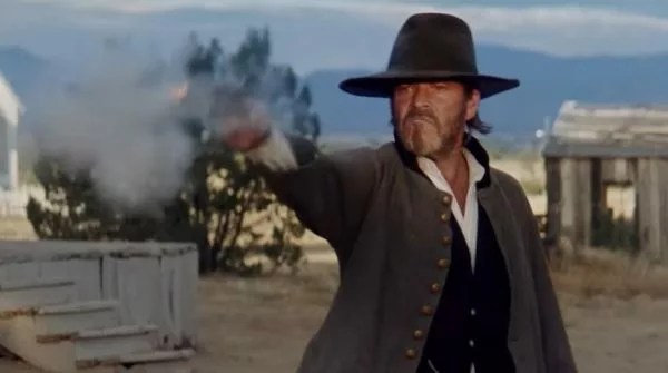 There’s a moment where Reno’s supposed to be shooting a rope about to hang somebody, and the take “One Take” Skiba uses plainly shows Kilmer discharging his rarely-reloaded six-shooter prematurely, as he’s raising it to aim it.