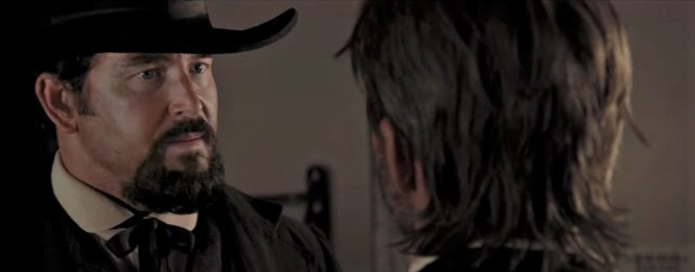 But dragging the gray-uniformed dead to the next town does Reno no favors. The saloon is filled with unconstructed Confederates and adorned with a stars and bars just above the bar. The “mayor” (Stephen Dorff) is former Col. Clancy T. Bishop, CSA.