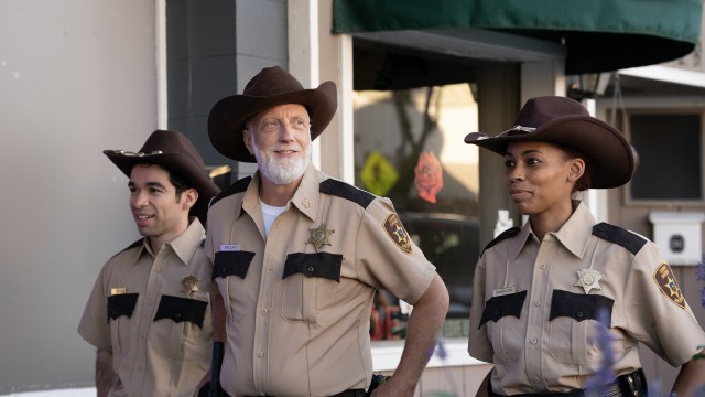 It’s a squirrely little berg — tumbleweed dirt roads lead in, but the designer downtown (California City, CA) has paved streets, shops and diners and lots of customers — some of them literal clowns. Sheriff Brooks (Chris Elliott) is prone to “You’re not from around here” threats, urging the newcomers to “stay humble” and stay out of trouble. And Sabrina Haskett plays his temptress daughter/bartender/jewelry store clerk who pretty much ensures that Leo, at least, follows neither piece of advice.