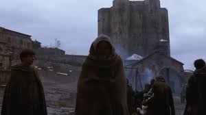 They’re greeted at the abbey by the abbot (Lonsdale). But one look at the lad (check out the Cover Girl makeup on Slater) has another monk pass on a warning.