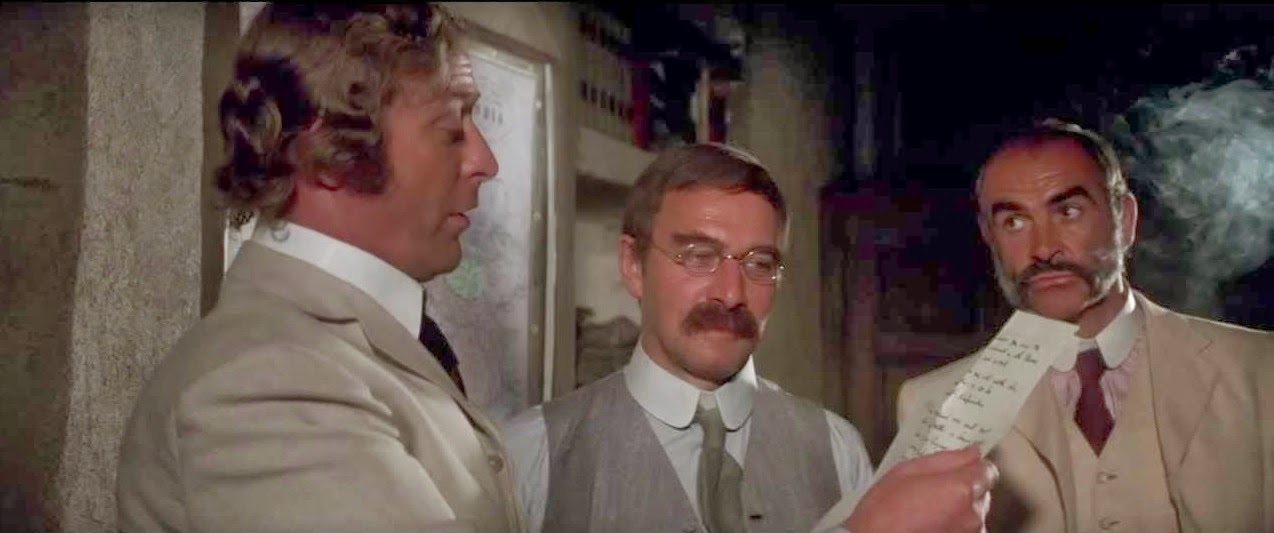 Peachy leans on Kipling for a favor, passing a message on to a mate he’s supposed to meet. The big and bluff and sideburned Daniel also speaks the language of their shared secret society, Freemasonry.