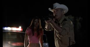 It’s got a bombshell who wears midriff-baring shirts, tight jeans (suitable for “Daisy Duke” cutcoffs) and sucks a lollipop like a pro, a Jesus-coiffed drifter who hitches a ride with her, vintage cars and vintage gas stations and diners and a good ol’boy sheriff who is no more a “good” old anything than most Florida sheriffs, then and now.