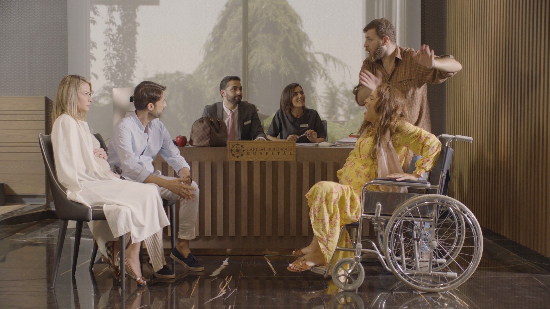 The Dorians, Raya (Pamela El Kik) and Carl (Chadi Haddad) show up at Capital Boutique Hospital by appointment. They leave the car with the valet, tip the doorman and make their way to reservations, where their birth “suite” is ready, they’re told (in French and Arabic).