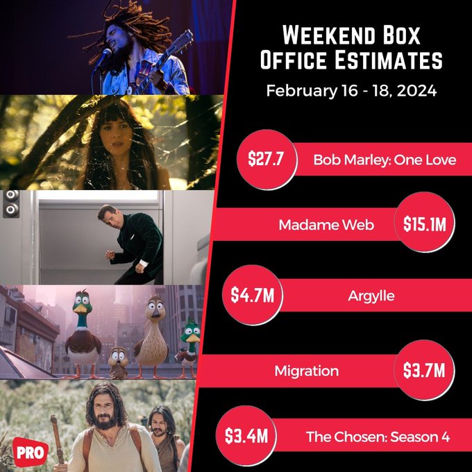 A big Valentine’s Day opening, and a big Friday have “Bob Marley: One Love” opening over $46 million, Wed.-Monday (Presidents Day). It almost earned $28 this weekend alone.