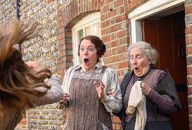 Women Police Officer Moss adorably enlists “friends” of Edith’s (Lolly Adefope, Atkins and Joanna Scanlan) in her investigation, even though she’s warned “women constables don’t sleuth.”