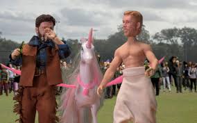 A “Road Warrior” cast-off narrator (Luke Hemsworth) tells us of a future when a virus has wiped out much life on Earth, and “all memory that surfing existed.” But the surf god Huey (Ronnie Blakely‘s voice and action figure) charges surfer Mick Fanning and World Surf League commentator Joe Turpel (sometimes in action figure form, sometimes as a unicorn) to assemble half a dozen former surfers, convince them that this sport once existed and get them on film.