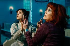 Fetching her boarding-schooled, “supernatural bull—t” disbelieving daughter (Ortega) and returning home to a house literally veiled in black for the funeral gives Lydia flashbacks and troubling glimpses of her old suitor, the strip-suited Creep from the Deep, Betelgeuse.