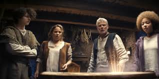 Starting the carved board game and carelessly putting it away is what lands them in 1497, in a Medieval version of Granpda’s house. They eventually figure out they’re each “characters” in the game — a shape-shifting “thief,” the “muscle” (Grandpa), a witch, an invisible woman etc.