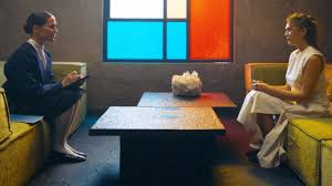 Director Fleur Fortune, a music video veteran, insists on setting up a sleek, austere “classic” sci-fi future of under-populated affluence with big open spaces outside and inside the McMansion by sea — Mondrian stained glass window, the works. But the emptiness conveys loneliness and doesn’t hide the ugly realities of how such star-kissed lives are achieved in civilization’s idealized next stage.