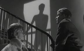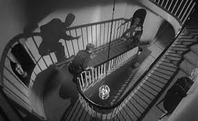 Take note of how the initial “scheme” is exposed — just Bogarde, naked in the shadows, smoking a cigarette and trying to figure out if his “gentleman” has returned and heard the romping he and Vera are carrying on upstairs, with Tony and Susan framed from downstairs, cowering in shocked silence.