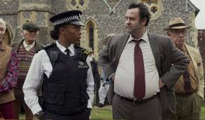 The plot ensares a traffic cop (Ackie) whom the club finagales a promotion to Criminal Investigation Division to help the always-eating Detective Inspector (Daniel Mays of “Vera Drake” and “Fisherman’s Friends”) and folds in literal cemetery plots and long-on-the-lam gangsters (Richard E. Grant).