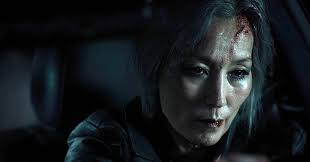 Lee is a somber presence at the center of this, handling the fight choreography (as if anybody believes a 65 year-old woman could kick this much ass) and rarely betraying emotions, an unsentimental killer who gets sentimental over a dog and the veterinarian who talks her into adopting it. Kim makes a properly belligerent smart-assed “brat with a death wish” foil, someone who has absorbed the “you’re killing a bug” ethos of their line of work.