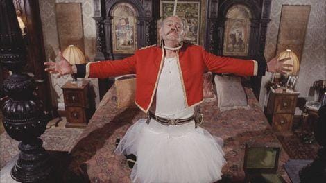 Lord Gurney (Harry Andrews), a widowed, titled nobleman and army veteran, dies during an accident that would have exposed the way he got his jollies, had that sort of thing ever become public. His autoerotic asphyxiation while in his dress uniform and cap — and a ballet tutu — goes awry. And just as he was planning to remarry and sire a fresh heir.