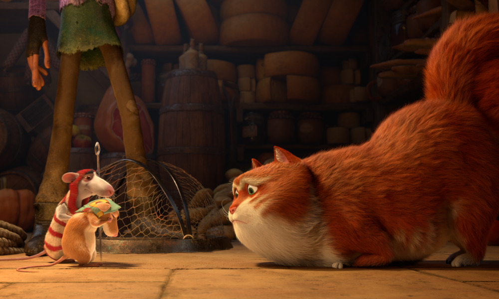 The rotund tabby — funny character design — shows up in a town unchanged since the Tudors and gives the locals the hard sell spiel about “rat INFESTATION,” romping through taverns and barns crawling with rodents, rhyming couplets with a carnival barker’s zeal. Friends, you have TROUBLE.