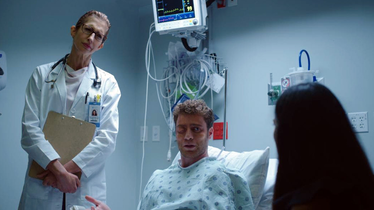 And Davidson may be the best working model of Russell Brand’s career experiment (something he up-front admitted in an interview with me), playing “the same character” over and over again, just a slight variation of his public persona. Davidson “acts” his “image,” the oversexed “vibe I put out there” that David brags about in “Bodies.” When we meet him, he’s blank-faced sporting a nasty black eye with pride. Drugs? On brand, too.