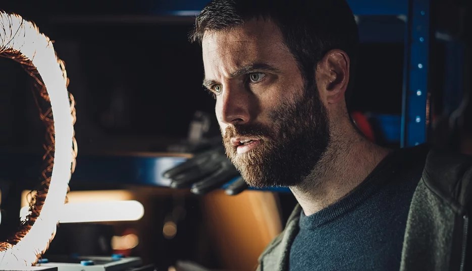 It’s a low-tech “technology” tale from the UK, about a cognitive brain researcher (Tom England) whose studies on people’s theta waves make him wonder about the static he’s hearing from this transceiver he has hooked up to his brain study coil. At some point he decides he’s speaking to the dead, that “The end is just the beginning.”