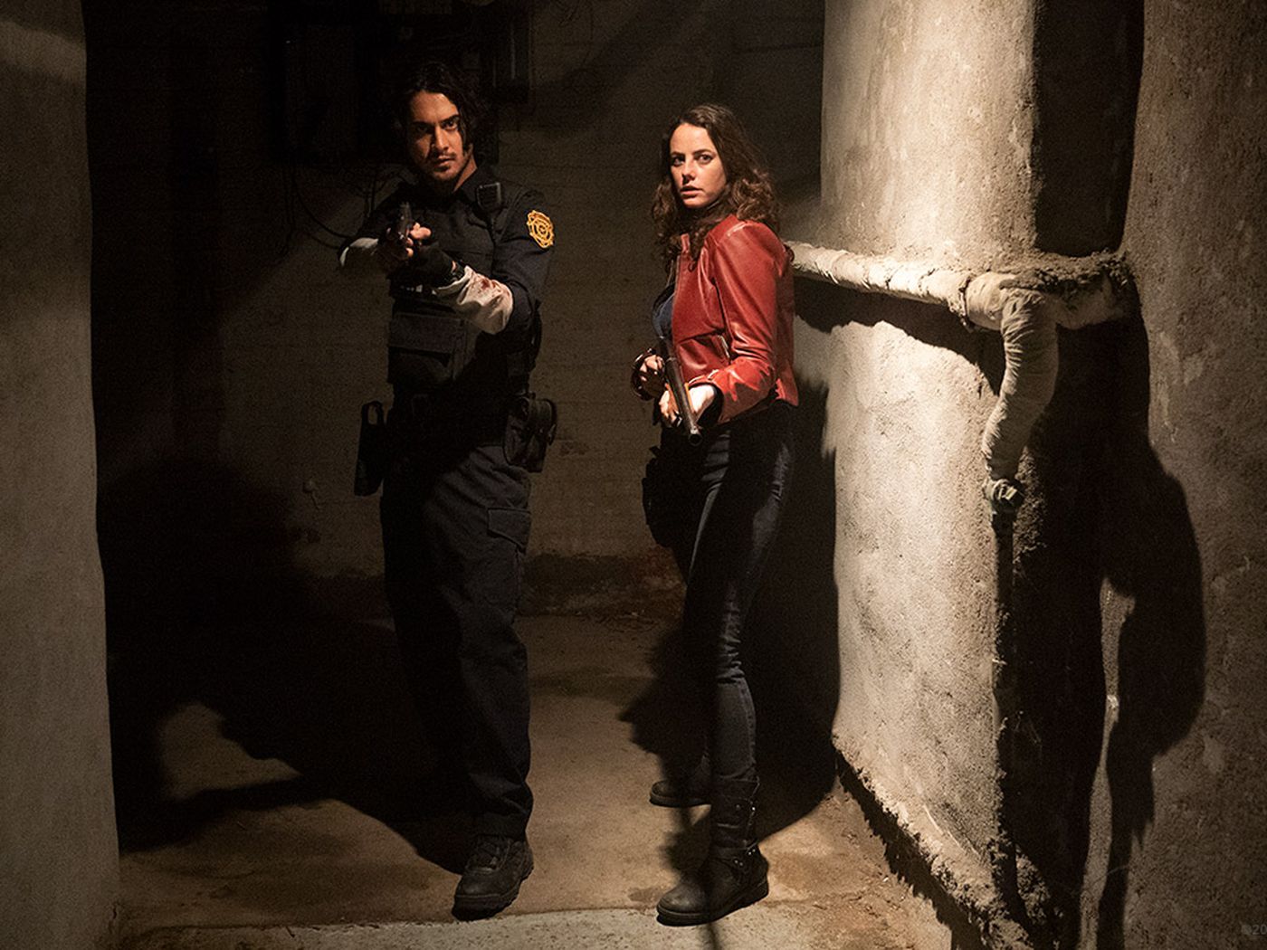 Claire and a rookie cop (Avan Jogia) without any discernable policing skills and a Johnny Depp haircut team up to survive in the police station, while Chris and a team of Raccoon City’s Finest, including Hannah John-Kamen and Tom Hopper, are prowling the halls of the old, spooky manor house of Umbrella’s founder (“Umbrella is your shelter in a storm!”), looking for clues left on a Palm Pilot and fighting off zombies.