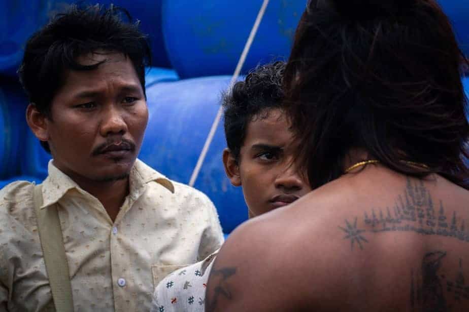 The fact that he has no money to pay the Cambodian equivalent of a “coyote,” the smuggler, means he will “go to a different factory” across the border. When he and a family man (Mony Ros) whom he throws in with are hustled about a boat “to take you to the factory,” the older man smells a rat.