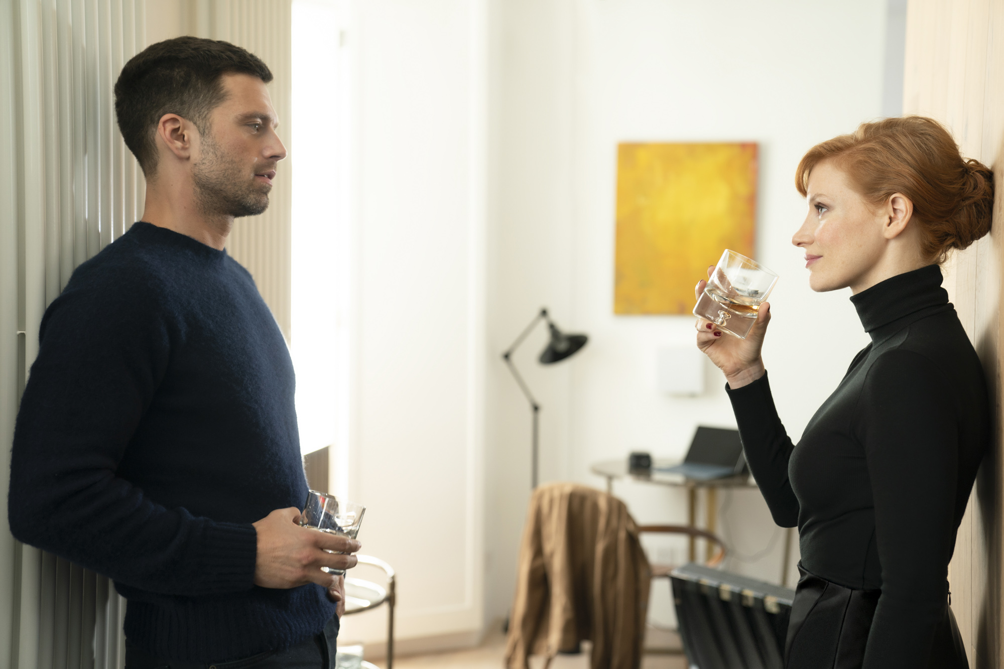 (from left) Nick (Sebastian Stan) and Mason “Mace” Brown (Jessica Chastain) in The 355, co-written and directed by Simon Kinberg.